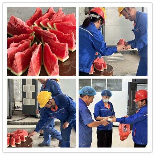 進入7月,酷暑難耐,在持續高溫的天氣里,為切實做好夏季防暑降溫工作,維護職工身心健康,公司黨工青婦互相配合、立即行動,精心熬制清熱解暑的綠豆湯,每天中午10:00至下午16:00前在綜合樓一樓準時為一線員工供應飲品,在設備安裝現場,組織后勤人員前往一線送去西瓜、雪糕、礦泉水等防暑降溫物品,同時對一線員工進行夏季安全宣傳普及。
